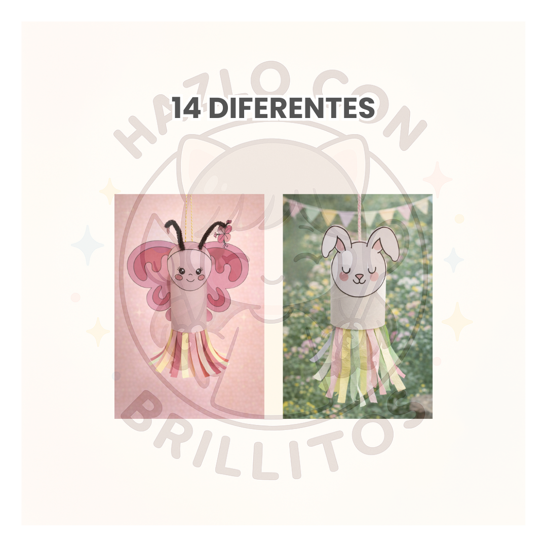 (12 animalitos + 1 arbolito + 1 sol), hechas para usarse con rollos de papel higiénico del tamaño real.